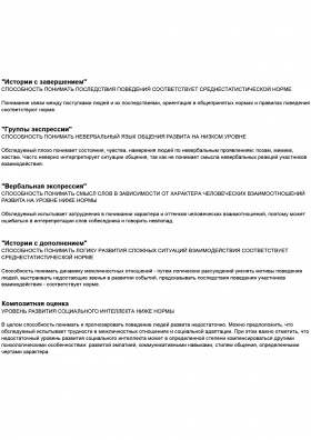 - «Истории с завершением»: измеряет фактор познания результатов поведения, то есть способность понимать связь между поведением и его последствиями, способность предвосхищать дальнейшие поступки людей на основе анализа реальных ситуаций общения (семейного, делового, дружеского), предсказывать события, основываясь на понимании чувств, мыслей, намерений участников коммуникации.