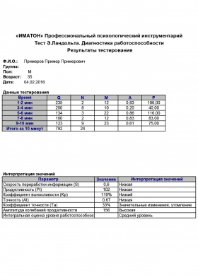 Стимульный материал представляет собой изображения колец с разрывами. Задание состоит в том, чтобы с максимальной скоростью просмотреть бланк и зачеркнуть в нем кольца с определенным положением разрыва. Процедура тестирования – бланковая. Бланки с результатами теста обрабатываются с помощью специальных ключей, также существует возможность внесения полученных данных в компьютерную программу, входящую в состав методики. Конечным результатом обработки являются графики, отражающие динамику основных показателей работоспособности и ее интегральная оценка.