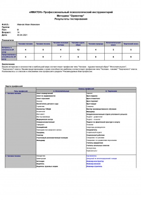 1. Анкета «Ориентация»: позволяет быстро и просто определить направленность клиента на ту или иную группу профессий, оценив такие параметры, как профессиональные склонности и профессиональные способности, и часто используется в случае затруднения клиента в выборе направления для обучения или переобучения.